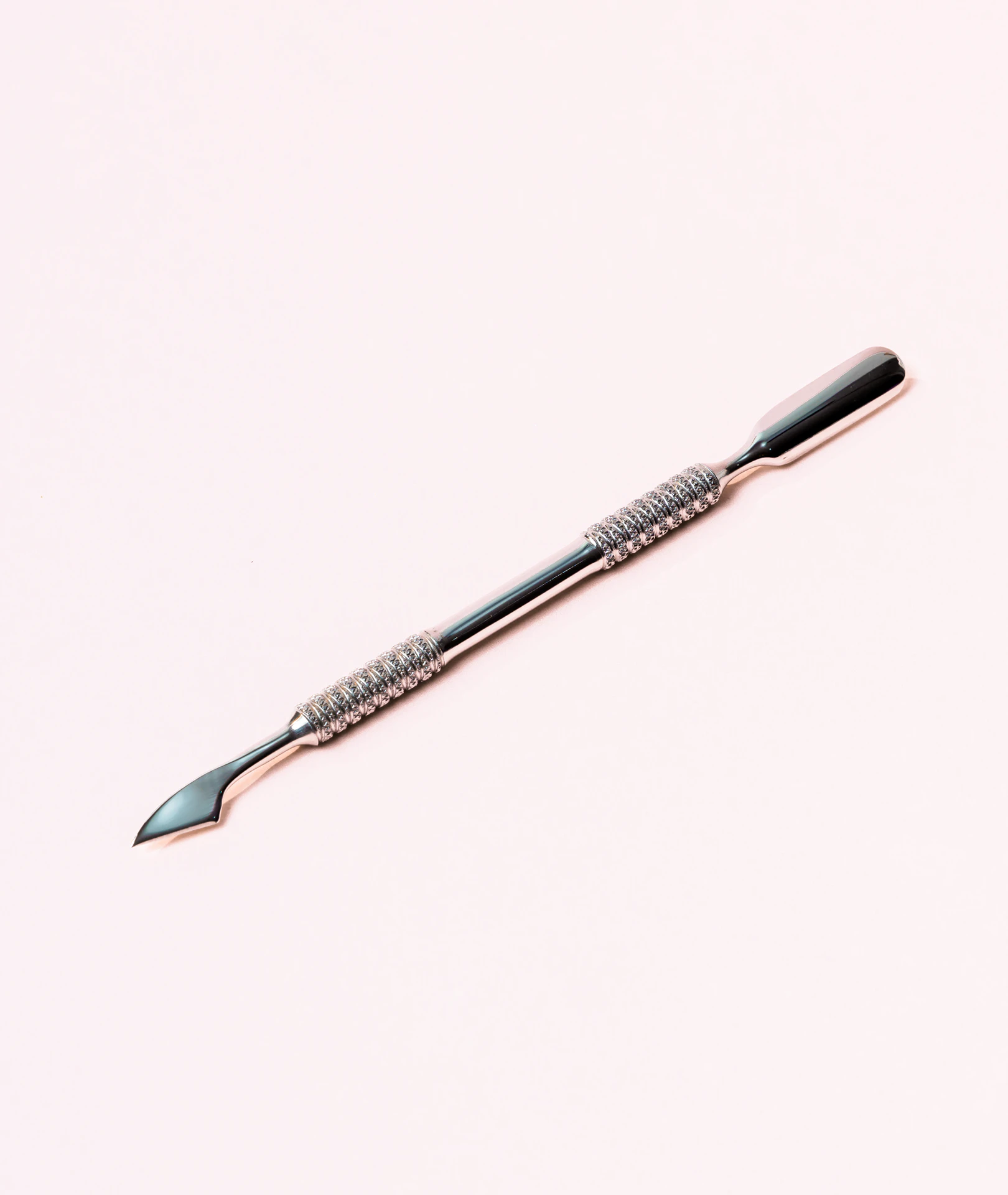 Capătul oblic, tip lamă/spatulă, este ideal pentru îndepărtarea controlată a cuticulelor aderente, a excesului de gel, acryl sau oja semipermanentă din zona cuticulei. Capătul plat și ușor curbat permite împingerea delicată a cuticulelor fără a deteriora unghia naturală.